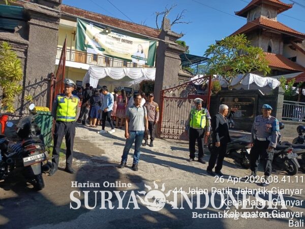 Gianyar, Surya Indonesia.net – Personel Polsek Gianyar melaksanakan pengamanan kegiatan ibadah Minggu yang dirangkaikan dengan kegiatan utus sambut serta peresmian renovasi gedung Gereja Ebenhaezer, yang berlokasi di Jalan Burung Gereja No. 2, Beng, Kecamatan/Kabupaten Gianyar, Minggu (26/4/2026).