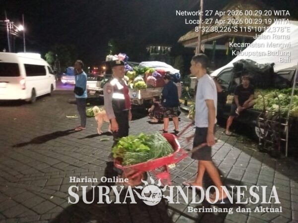 Mengwi, Surya Indonesia.net – Meningkatnya aktivitas masyarakat di kawasan Pasar Mengwi mendapat perhatian dari jajaran Samapta Polsek Mengwi. Untuk memastikan situasi tetap aman dan kondusif, personel Samapta melaksanakan patroli dialogis di area pasar, ketika masyarakat mulai memadati pasar untuk melakukan aktivitas jual beli dipasar tradisional yang terletak didesa Mengwi, Kecamatan Mengwi, Kabupaten Badung. Senin dini hari (27/4/2026).