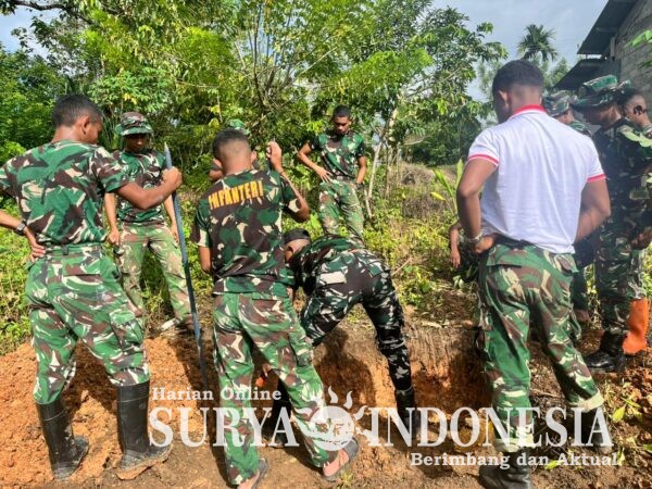 Kegiatan ini merupakan bagian dari upaya TNI dalam meningkatkan kualitas sanitasi dan kesehatan masyarakat di wilayah pedesaan. Dengan penuh semangat, anggota Satgas bersama warga setempat bahu-membahu melakukan penggalian lubang sebagai dasar pembangunan fasilitas MCK yang layak dan higienis.