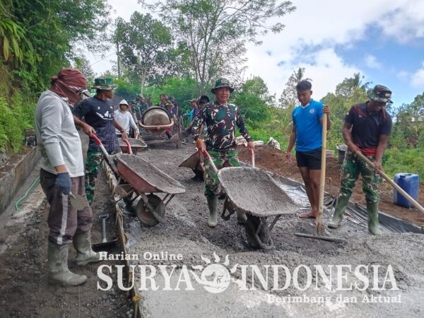 KARANGASEM, Surya Indonesia.net – Cuaca yang tak menentu kadang hujan dan panas di lokasi TNI manunggal Membangun Desa (TMMD) Ke-128 Kodim 1623/Karangasem tidak menyurutkan semangat anggota Satgas TMMD bersama warga masyarakat dalam pengerjaan pembangunan jalan rabat beton sepanjang 1.450 meter dan tebal 15 cm, yang saat ini progresnya telah mencapai 25%, di Dusun Kubakal, Desa Pempatan, Kecamatan Rendang, Kabupaten Karangasem, Rabu (29/04/2026).
