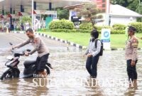 Badung, Surya Indonesia.net – Personel Polres Kawasan Bandara I Gusti Ngurah Rai menunjukkan kepedulian dengan membantu warga yang kendaraannya terjebak genangan air di depan