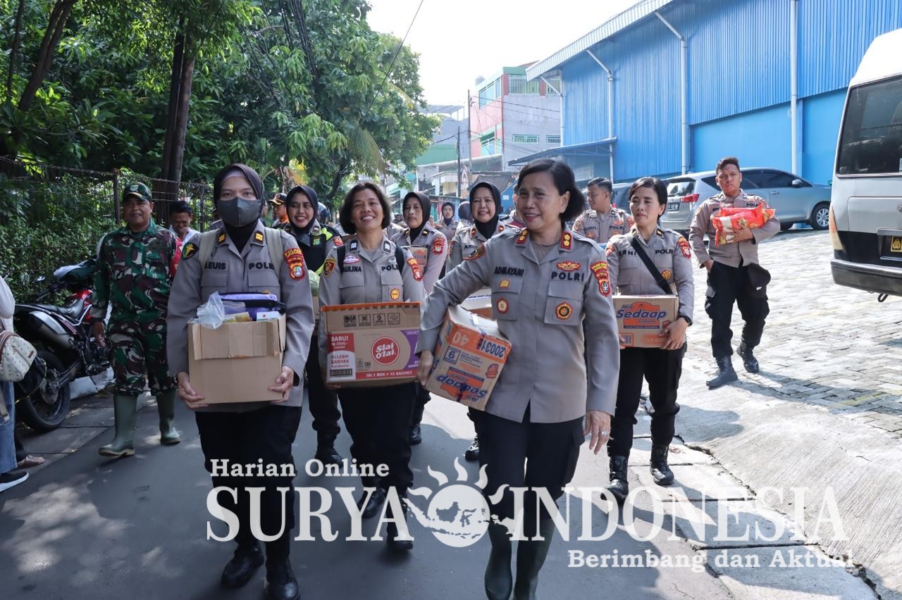 Jakarta , Surya Indonesia.net – Polisi Wanita (Polwan) dari Polres Metro Jakarta Barat turun langsung ke lokasi banjir di kawasan Kebon Jeruk untuk menyalurkan