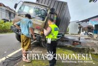 Tabanan, Surya Indonesia.net – Unit Lantas Polsek Selemadeg dipimpin Aipda I Putu Eka Susrawan Putra bersama piket fungsi bergerak cepat menangani insiden amblesnya truk