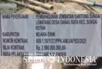 SURYA INDONESIA NET- Muara Enim, 13 Februari 2026 – Pembangunan jembatan gantung di Desa Danau Rata, Kecamatan Sungai Rotan, Kabupaten Muara Enim, menuai sorotan