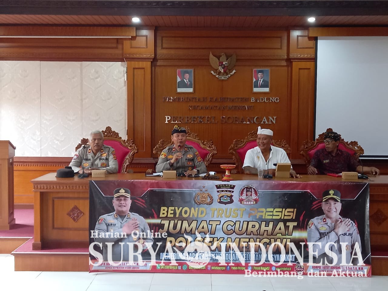 Mengwi , Surya indonesia.net – Kepala Kepolisian Sektor Mengwi Kompol I Ketut Adnyana T.J S.Sos.,S.H.,M.M., melaksanakan kegiatan Jumat Curhat di aula Kantor Desa Sobangan,