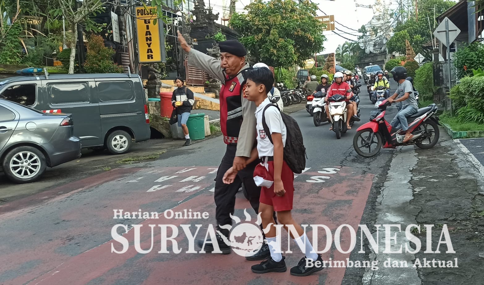 Gianyar, Surya indonesia.net – Anggota Patroli Unit Samapta Polsek Gianyar dan Anggota Unit Lalu Lintas Polsek Gianyar yang melaksanakan pengaturan dan penyebrangan dengan Kuat