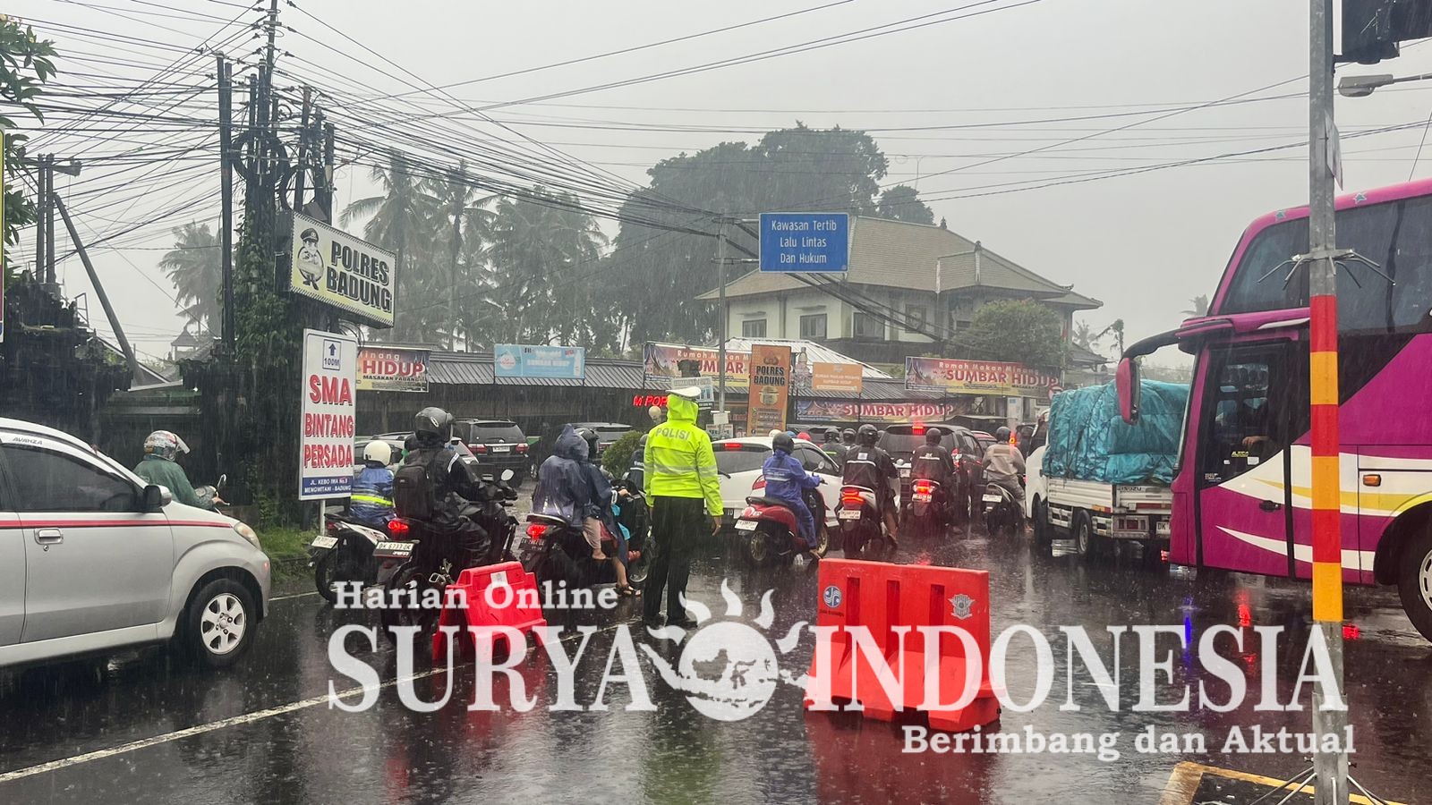 Mangupura , Surya Indonesia.net – Meski hujan deras mengguyur wilayah Kabupaten Badung, tidak menyurutkan semangat Personel Satuan Lalu Lintas Polres Badung untuk mengatur kendaraan